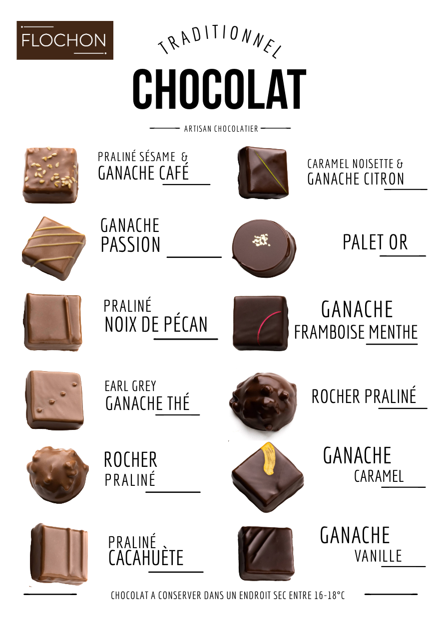 Présentez en coffret de 28 pièces, nos chocolats traditionnels sont composés de chocolats avec des ganaches & des pralinés en chocolat lait et/ou en chocolat noir.